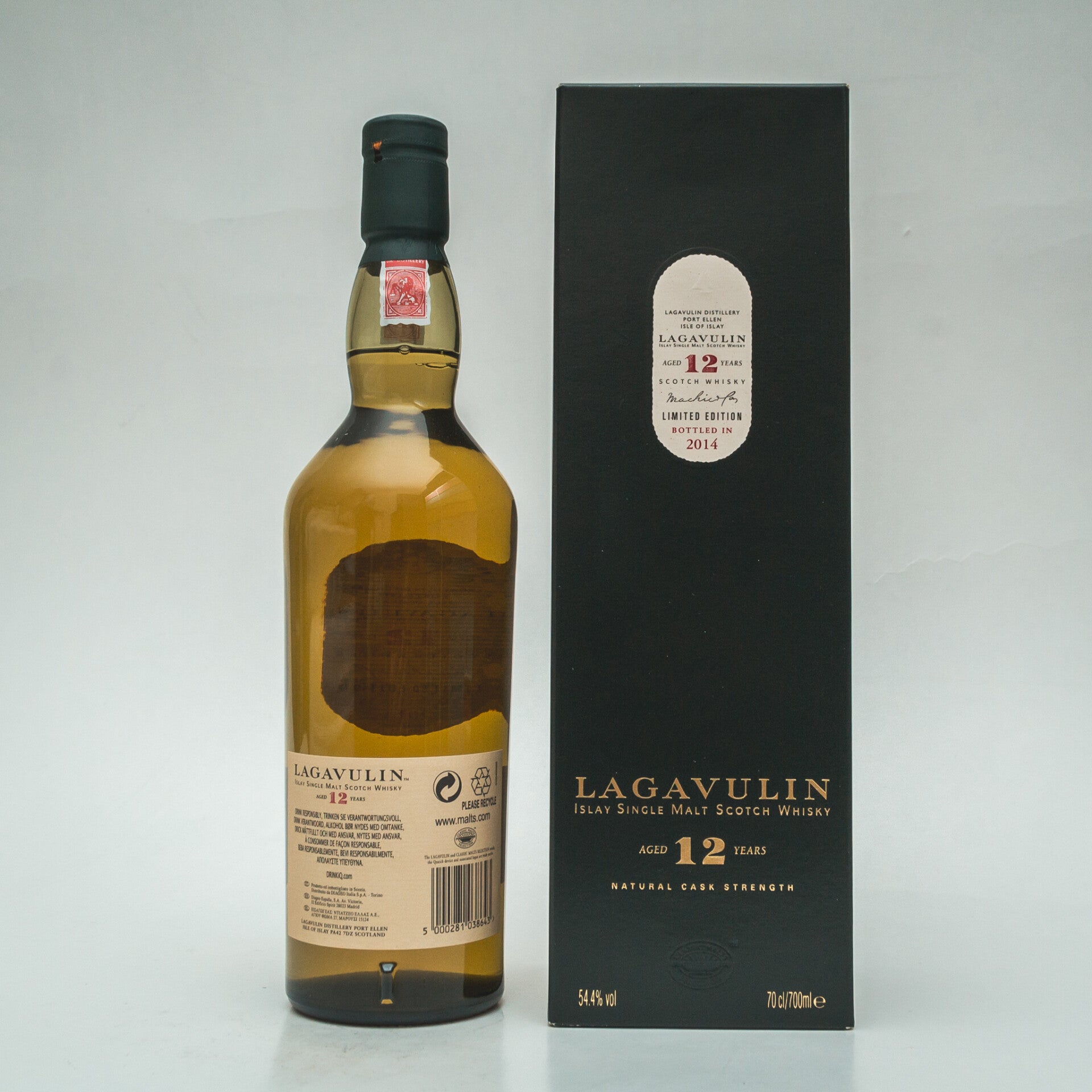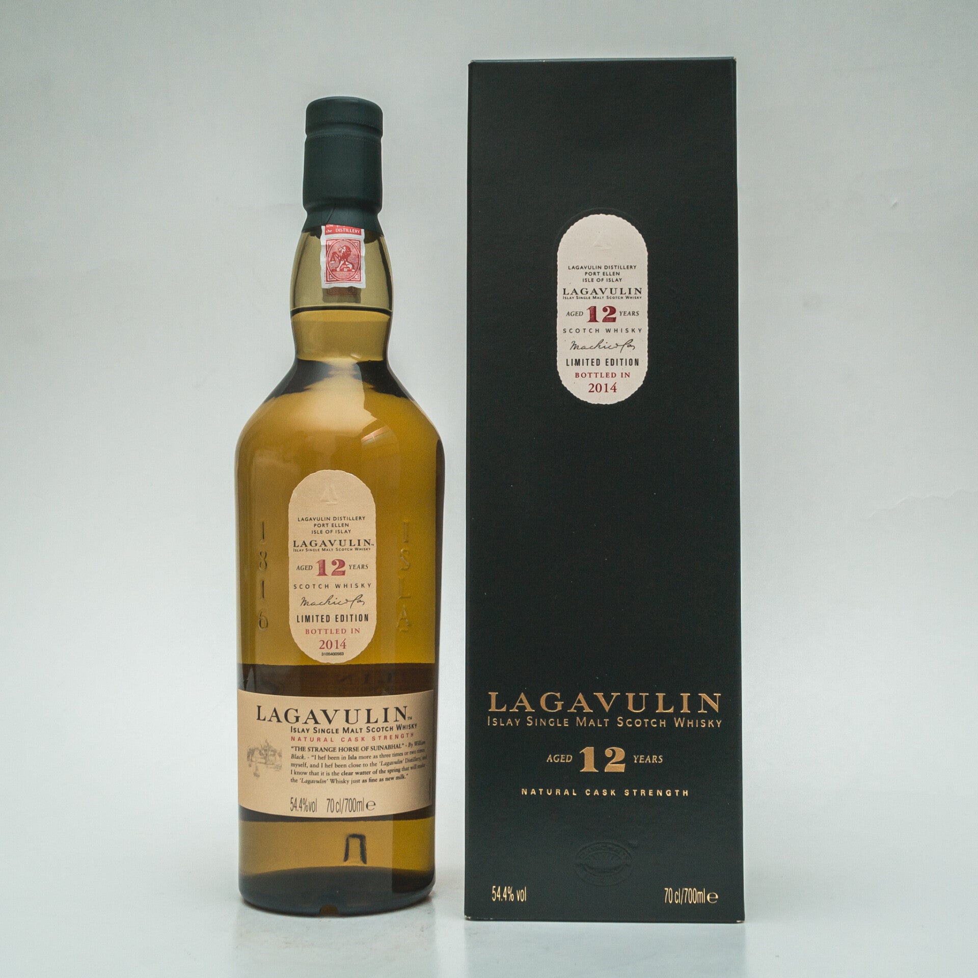Lagavulin 12 years Cask Strength 2014 is een van de frequente favorieten van Diageo's Special Releases. Gemaakt van in 2001 en 2002 gedistilleerde malts, waarna in gebruikte Amerikaanse eikenhouten vaten gerijpt. Smaken van gekonfijte citroenen, limoen, gemengd fruit en noten. Allen verpakt in een grote pluim van rook. Lange afdronk.