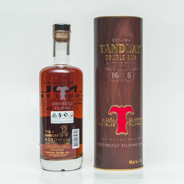 Tanduay Double Rum is een mooie bruine gekleurde rum met zachte amberkleurige tinten. Hij is afkomstig uit de Filipijnen en bestaat deels uit rum dat voor zestien jaar op eikenhouten vaten heeft mogen rijpen en een die voor 5 jaar heeft gerijpt. Zijn aroma is vol geladen met de heerlijke tonen van gegrilde ananas, mango en frisse citrus tonen. In zijn smaak komen de tonen van fruit sterker naar voren met veel romige vanille en kruiden. Gecombineerd met geflambeerde banaan en bruine suiker die alles goed samen trekt. Tanduay Double Rum heeft een alcoholpercentage van 40%.