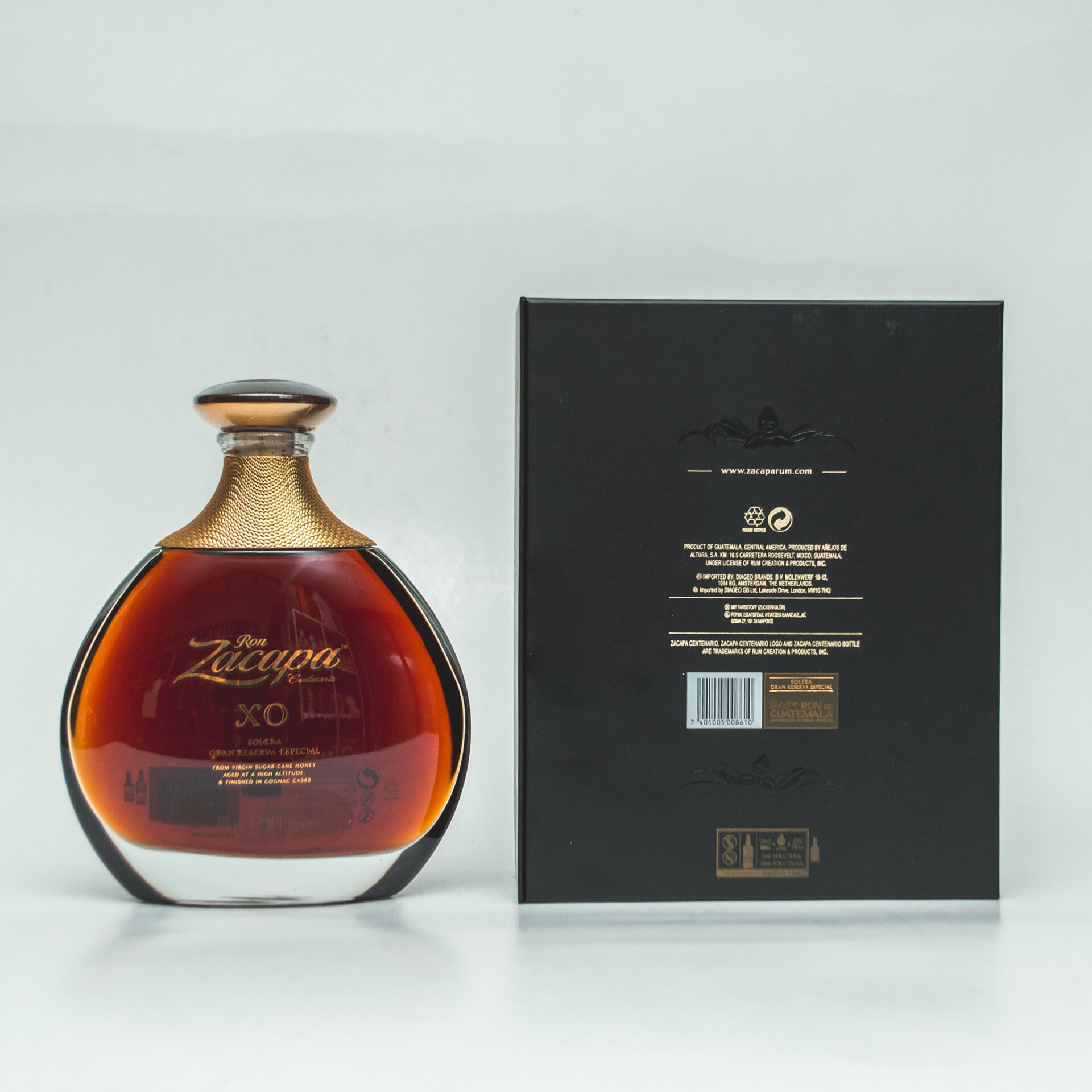 De Zacapa XO Rum werd samengesteld met rums waarvan de jongste rum minimum 6 jaar oud is en de oudste tot wel 25. Prachtige rum uit de bergen in Guatemala. Zacapa rijpt in ijle berglucht 2300 meter boven zeeniveau. Hierdoor rijpt de rum langzamer op een natuurlijke wijze. Door deze langzame rijping krijgt Zacapa XO een buitengewoon aroma met een zachte smaak. De rum rijpte op Amerikaanse whisky vaten, Spaanse sherry, Pedro Ximenez vaten. Uiteindelijk volgde er een finish op Cognac vaten. Zacapa rum rijpt volgens het 'solera systeem'. Bij dit systeem zijn verschillende vaten met elkaar verbonden, waardoor een constante kwaliteit kan worden nagestreefd. Geniale aroma's vol maturiteit en klasse. De Zacapa XO komt in een prachtige decanter fles in een mooie stijlvolle verpakking, een ware streling voor het oog.